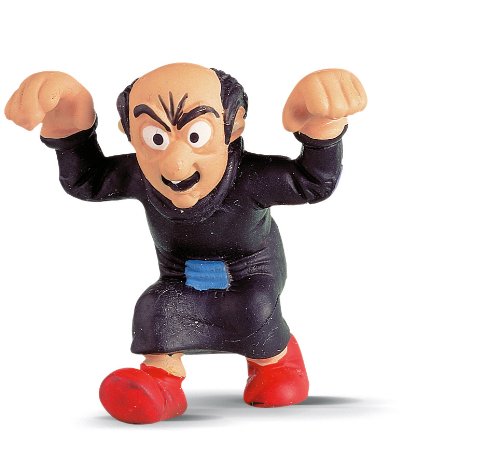 Hunched with his hands up, Gargamel hurries to hurl, "Where are those Smurfs!".