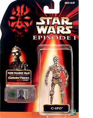 Star Wars Episode 1 Collection 1 Battle C-3PO figure. This figure talks through a special reader with a CommTech Chip. C-3POs CommTech Chip lines are: 1. Hello I am C-3PO Human Cyborg relations 2. How might I serve you? 3. My parts are showing? Oh my goodness! 4. What do you mean naked? This chip interacts with Anakin Skywalker, R2-D2 & Padme Naberrie. Brand new, mint on card. Mint on Card. Produced in 1998 by Hasbro. Release 5585500.00