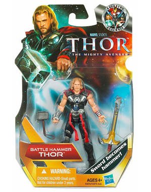 Thor Mighty Avenger Battle Hammer Action Figure Thor is known across the cosmos as the mightiest warrior in all the Nine Realms. He has defended the divine kingdom of Asgard for a millennium from the darkest forces of the Marvel Universe. With his legendary hammer, Mjolnir, in his hand, he is an unstoppable force who commands both the lighting and the storms.Defeat the forces of evil wherever you and your Battle Hammer Thor figure find them. This brawnylooking warrior is already a force to be reckoned with, but his sword accessory holds an extra advantage it becomes a battle hammer for crushing his foes! The battles you and your mighty Thor figure fight are sure to become legendary.Figure is 3.75 tall and comes with sword accessory.