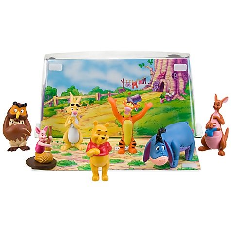 Set includes Winnie the Pooh, Tigger, Piglet, Eeyore, Rabbit, Owl and Kanga with Roo toy figuresScenic display packaging with 100 Acre Wood backdropBack of package folds down to form a Rabbit's House and garden setting, fastens back again with self-stick fabric closurePlastic/PVCFigures up to 3 1/2'' HImportedAges 3+